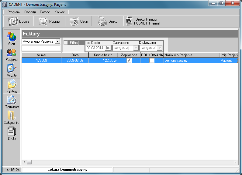 Lista faktur wybranego Pacjenta zawiera ich liczbę, numery, daty i kwoty. Po podwójnym kliknięciu na wybraną fakturę zobaczymy jej dokładną zawartość.